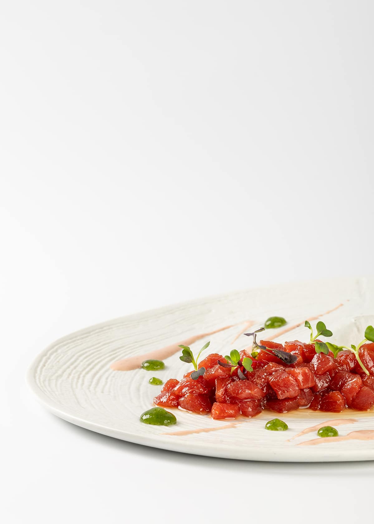 Contrast marí i terrenal: la suavitat de la tonyina fresca amb el punt salí de la salicòrnia i l’acidesa subtil de la magrana.
