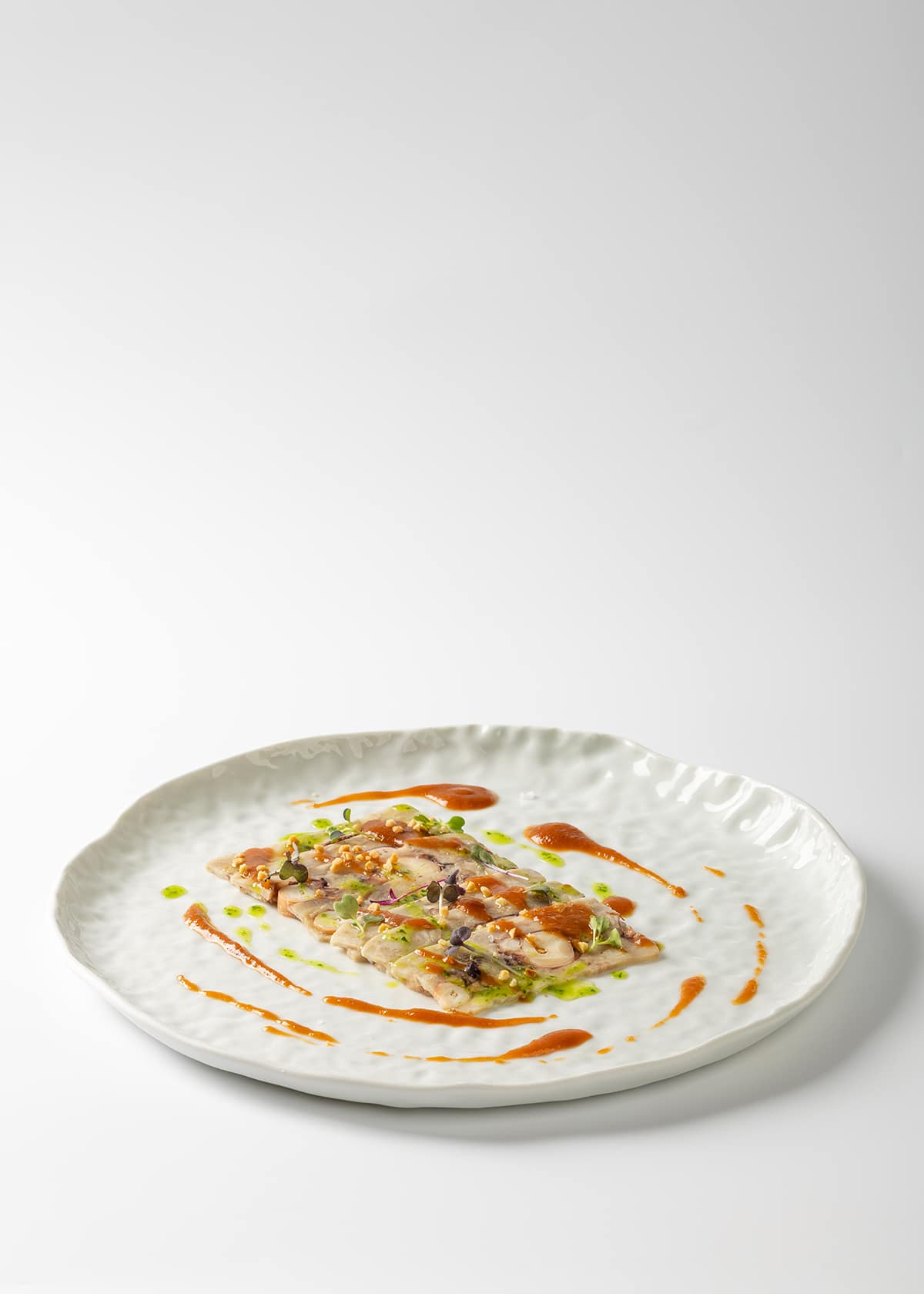 Carpaccio de peus de porc i pop amb salsa de cervesa i fruits secs