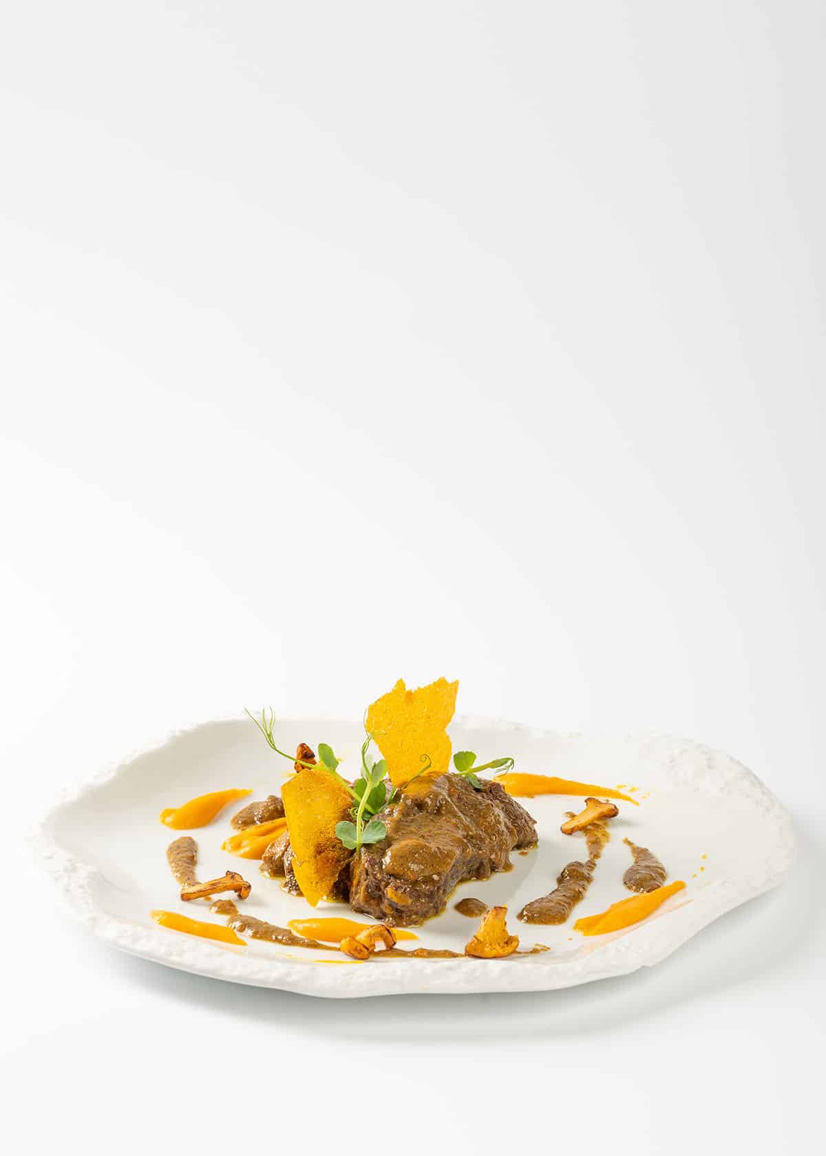 Melós de vedella amb salsa de fricandó, bolets i crema de carbassa